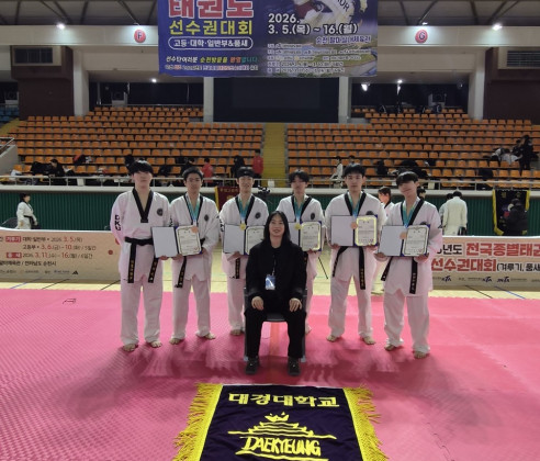대한태권도협회가 주최하고 대경대 한류캠퍼스 강보현 교수의 지도로 7일까지 전라남도 순천에서 개최되고 있는 2026 전국종별태권도선수권대회에서 태권도과가 1위 2명, 3위 3명으로 총 5개의 메달을 수상했다. 우선 68kg급에서는 박지훈, 홍성주 두 명이 금메달을 획득했으며, 80kg급에서는 전민준이 3위, 63kg급에서는 오병인이 3위, 54kg급에서..
