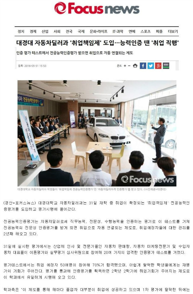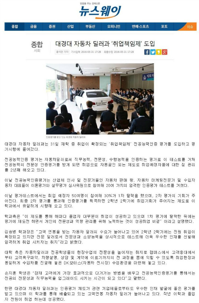 우리대학 자동차딜러과가 '취업책임제' 전공능력인증 평가를 도입 실시하고 있어 언론의 주목을 받았습니다.