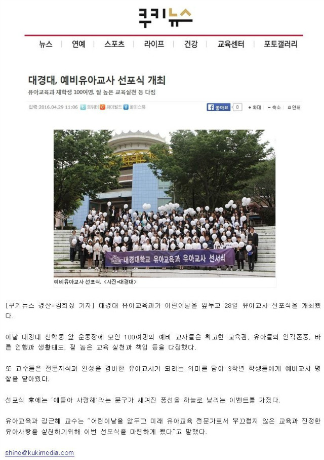 우리대학 유아교육과가 어린이날을 앞두고 유아교사 선포식을 개최하여 언론의 주목을 받았습니다.