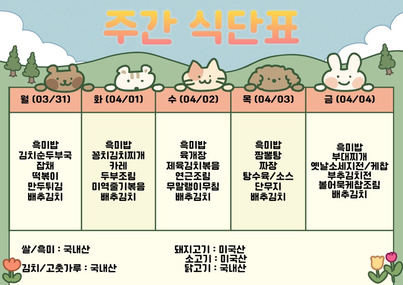 한류캠퍼스(남양주) 식단표 안내 - 03/31(월) ~ 04/11(금) 조회수 332 등록일 2025-03-31 09:17 한류캠퍼스(남양주) 식단표 안내 <03/31(월) ~ 04/04(금)> <04/07(월) ~ 04/11(금)> 이전글 재난 사태(산불) 피해학생 대상 학사 지원(공인 출석) 안내 다음글 테마캠퍼스(경산)식단표 안내(학생식당,교직원식당) 3/31(월)~4/4(금) 목록