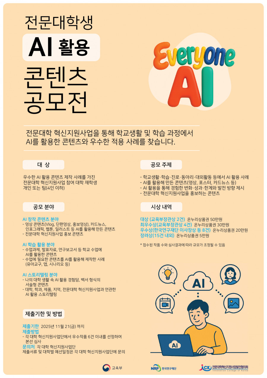 전문대학 혁신지원사업발전협의회에서 「2025년 전문대학 혁신지원사업 AI 활용 콘텐츠 공모전 -대학 생활 속 나의 AI 활용백서-」를 추진하오니, 재학생 여러분의 많은 관심과 참여 부탁드립니다.