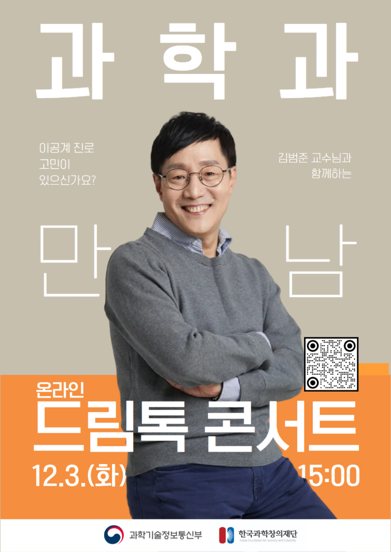 과학기술 진로 컨설팅 온라인 드림톡 콘서트 안내(과학기술 분야 진로 컨설팅, 성균관대학교 김범준 교수) - 물리학으로 보는 세… 조회수 895 등록일 2024-11-25 11:30 이전글 2024 호텔&레스토랑 산업전 전시회 및 포럼 참관 안내 다음글 2024학년도 하반기 AI 전문과 교육과정 안내 목록