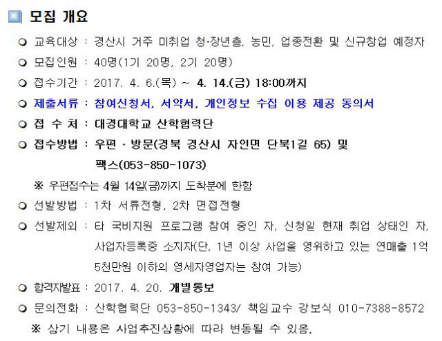 [수제맥주 전문인력 양성과정] 교육생 모집 공고[국비지원 무료교육] 조회수 6,347 등록일 2017-04-06 19:03 첨부파일 1.참여신청서.hwp (12.5K) 2.서약서.hwp (11.0K) 3.개인정보의 수집 이용 제공동의서.hwp (28.5K) 『수제맥주 전문인력 양성과정』 교육생 모집 공고 이전글 실버산업 맞춤형 서비스 프로그램 전문인력[요리, 미술, 음악, 노인운동&레크리에이션 지도자] 양성과정 교육생 모집 다음글 일본취업 맞춤형 교육프로그램 참가안내(예정공고) 목록 수정 삭제