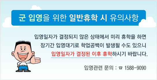 군 입영을 위한 일반휴학 시 유의사항 조회수 6,383 등록일 2015-06-15 17:45 군 입영을 위한 일반휴학 시 유의사항 이전글 2015 이공계 대학생 오픈챌린지 운영 사업 참여 학생 모집 다음글 2015 내일로 티켓 및 내일로 티켓 바우처(교환권) 활용 안내 목록