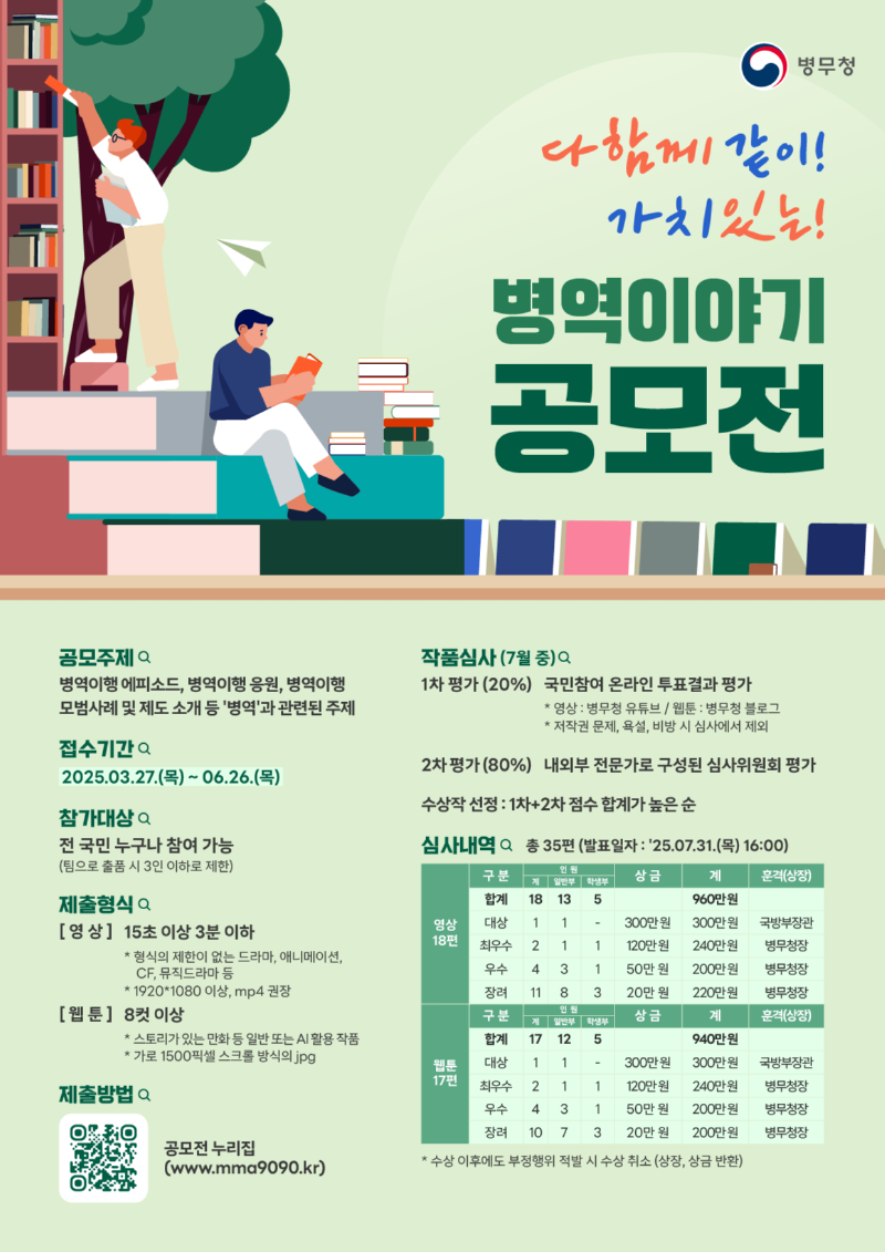 다 함께 같이! 가치있는 병역이야기 공모전 안내 조회수 600 등록일 2025-04-08 13:34 이전글 「2025 우수 예술교육가 발굴대회」공모 안내 다음글 안읍창 문화창고 외부 디자인 공모 안내 목록