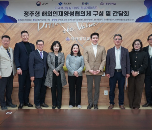 RISE 사업 일환 ‘지역정주 해외인재양성 협의체’ 발족대경대학교(총장 이채영)는 12월 5일, RISE(지역혁신중심 대학지원체계) 사업의 일환으로 지역정주 해외인재양성 협의체를 발족하고 지역 기반 글로벌 인재 육성체계 구축을 본격적으로 추진했다. 협의체는 경상북도청,경산시청,영천외국인센터, 엠엔티코리아, 포항스테이호텔, K드림글로벌인재지원센터, 코오롱호텔 힐튼호텔 등 지역 주요 기관·기업으로 구성되어 있..